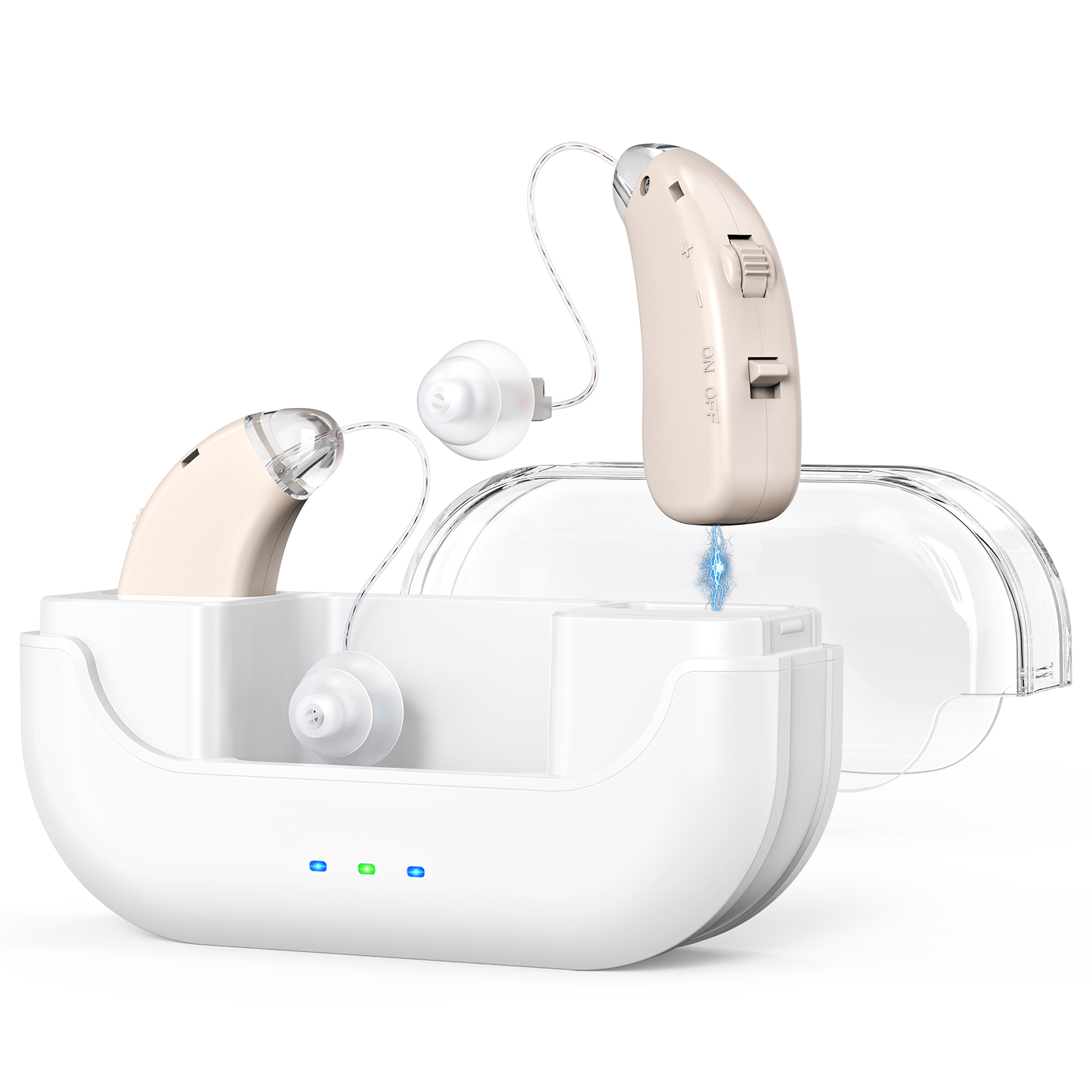 Rechargeable Hearing Amplifier with Charging Case – Compact Sound Enhancer for Daily Use, Noise Reduction & Clear Audio (White & Transparent Case, Skin Tone)